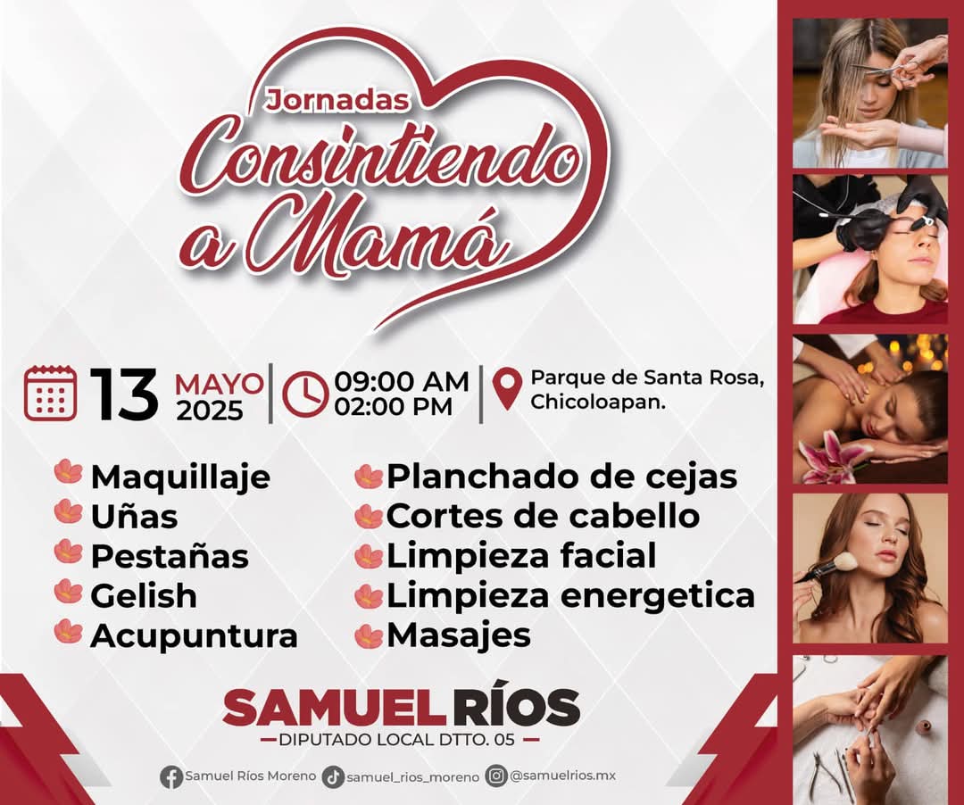 El Dip. Local Samuel Ríos Moreno hace una cordial invitación este 13 de Mayo en el Parque de Santa Rosa en Chicoloapan a la Jornada " " Consintiendo a Mamá" la cual contara con servicios totalmente ¡GRATUITOS!